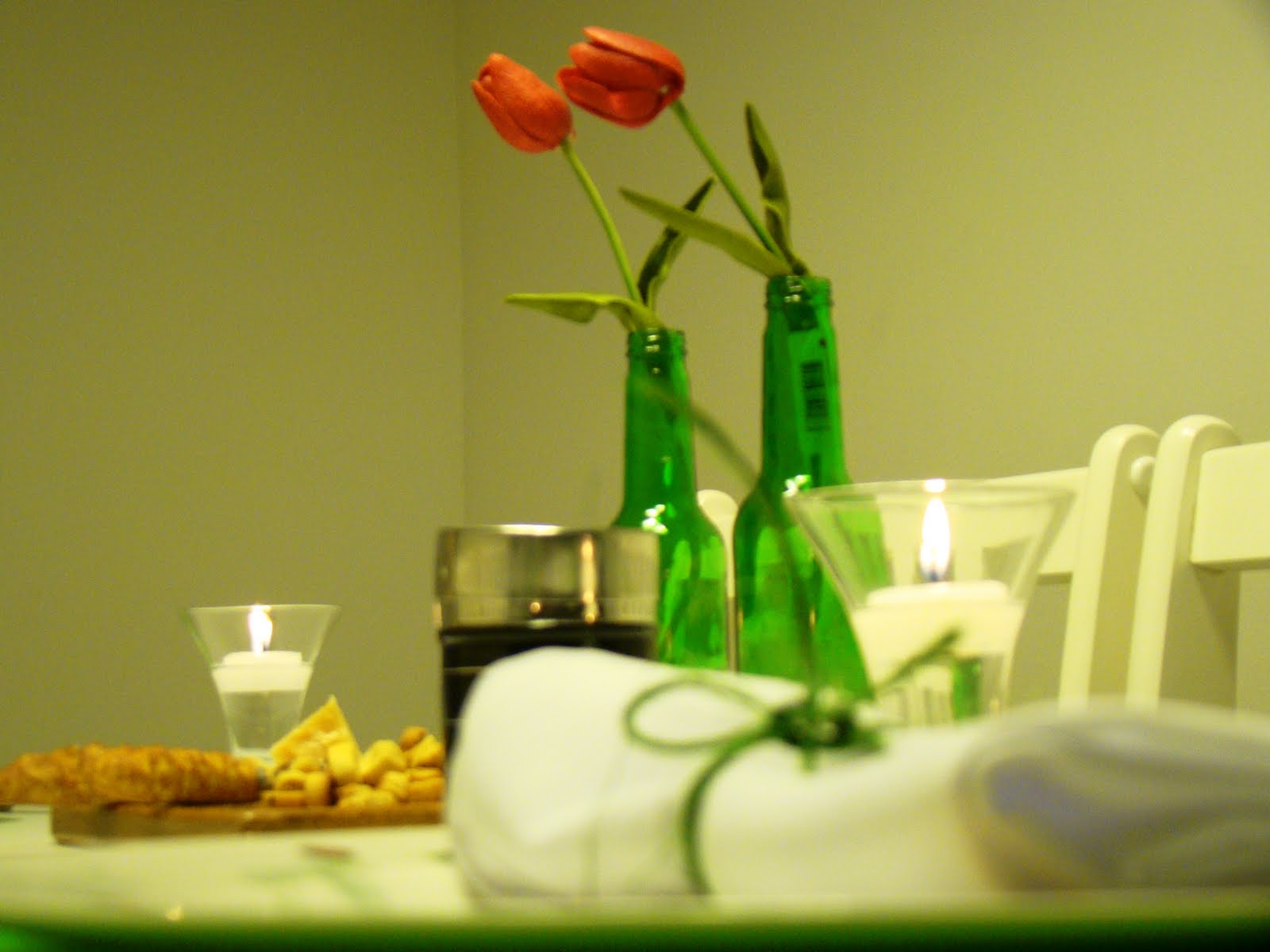 Não se esqueçam de arrumar uma bela mesa para o almoço ou jantar. Observem que usei itens de uso diário, como as louças e talheres... Como eu não tinha nenhuma florzinha natural, apelei para as artificiais mesmo. Então, reutilizei 2 garrafas de cervejas como vaso, colando essas tulipinhas fofas para dar uma incrementada.